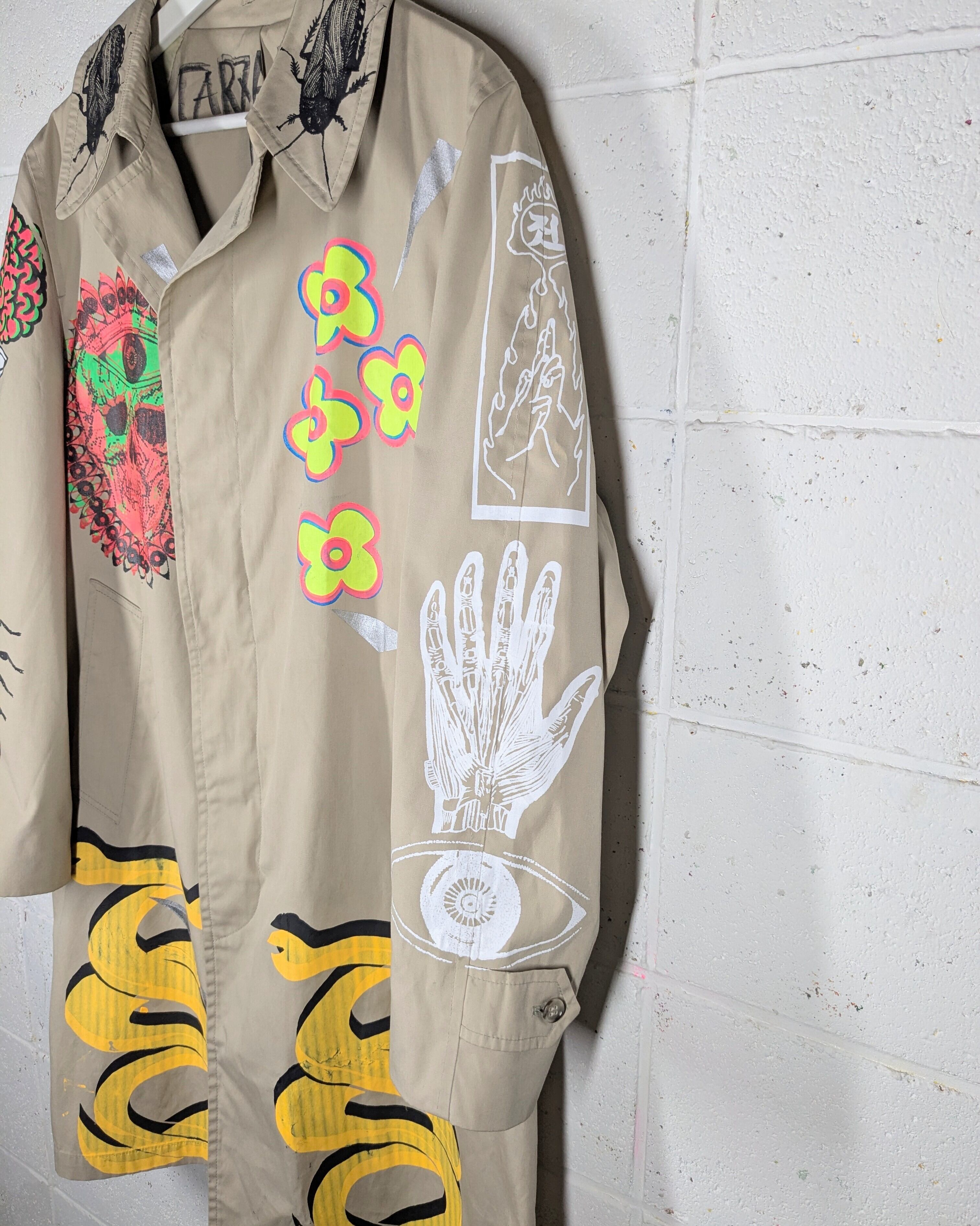 VINTAGE?なコートにハンドシルクスクリーンと手描きを施しております。
