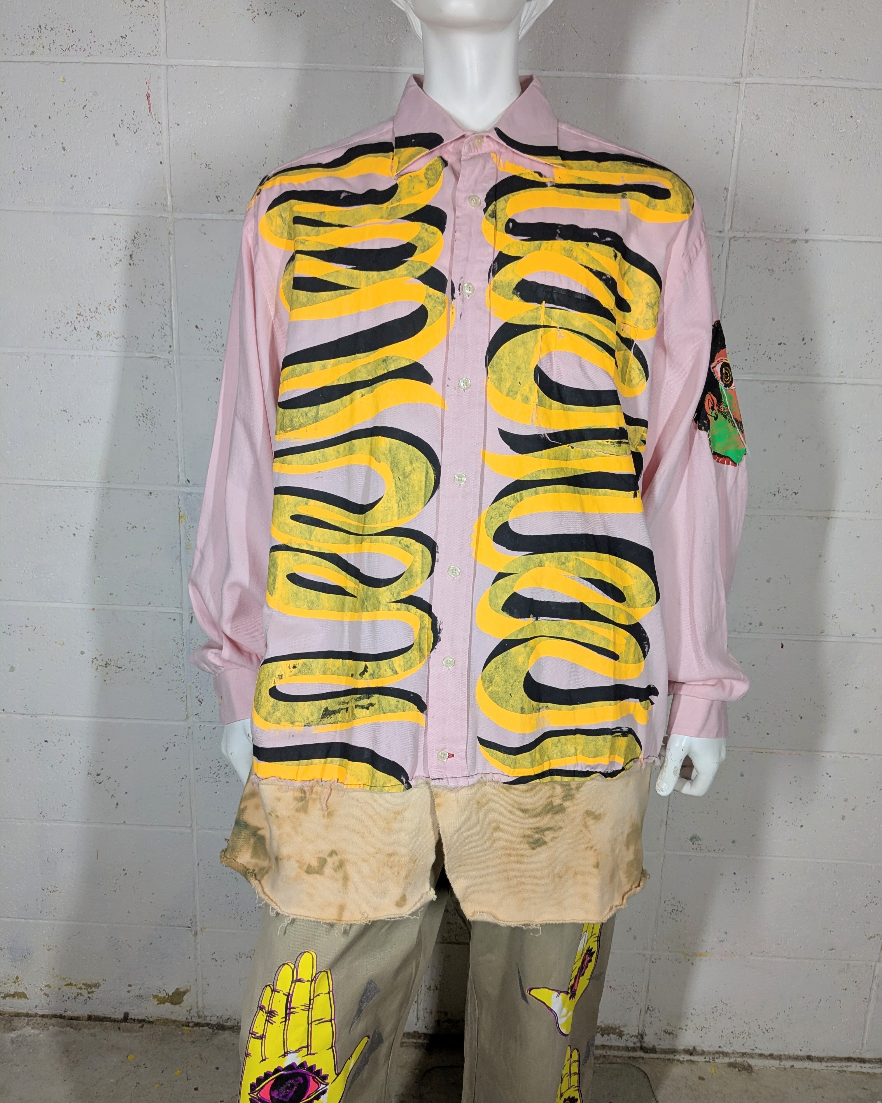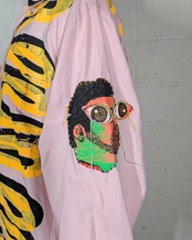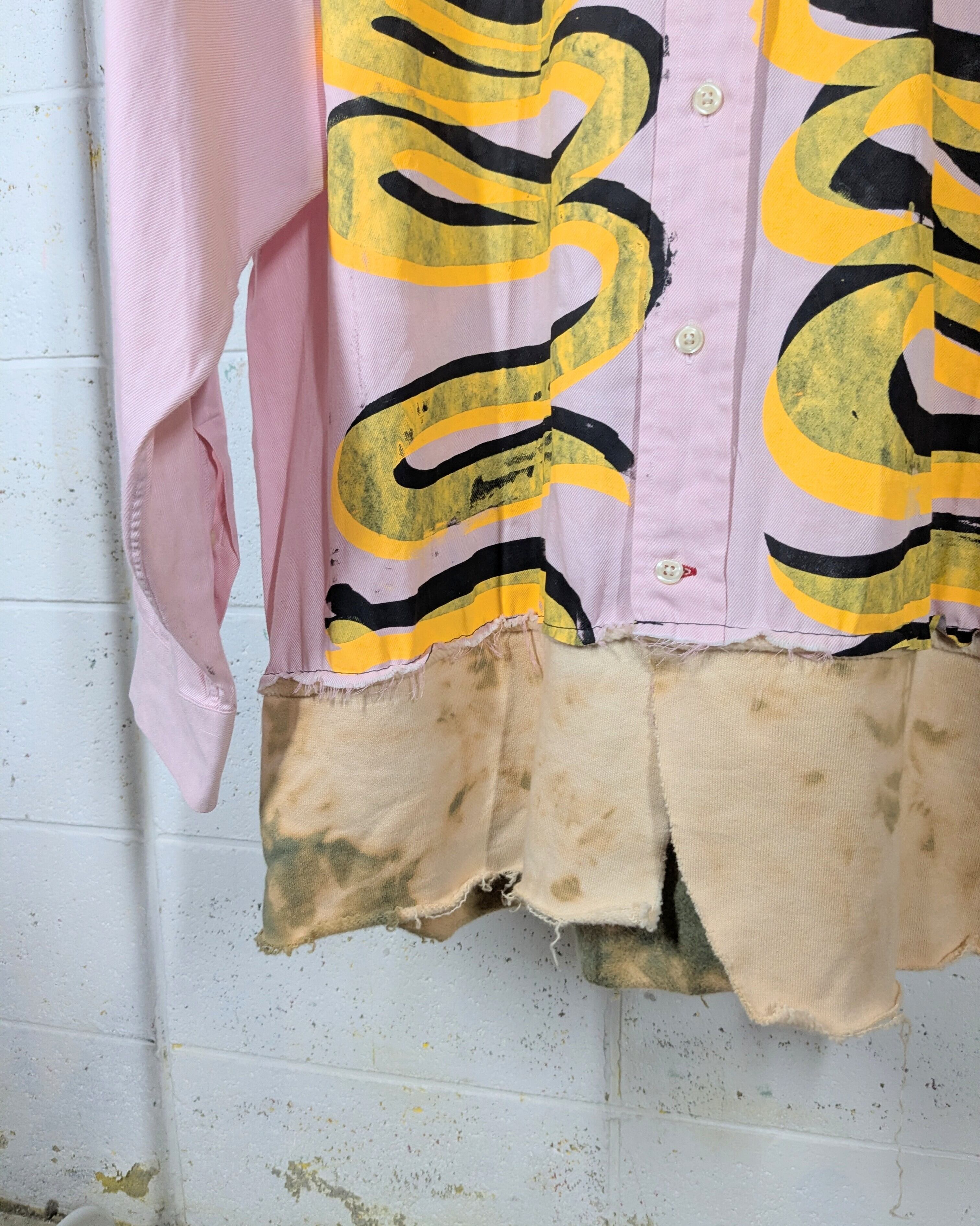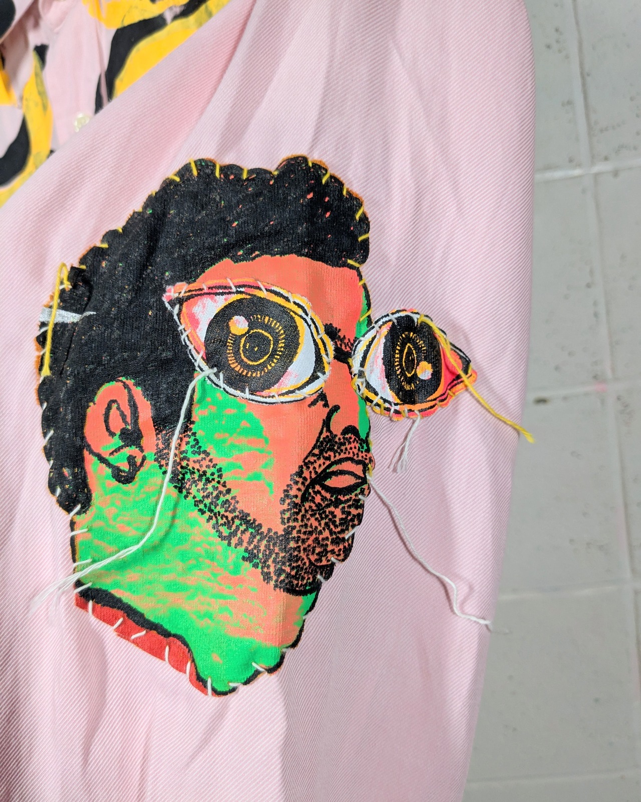セカンドハンドなシャツにハンドシルクスクリーンをして脱色した生地を縫い付けております。