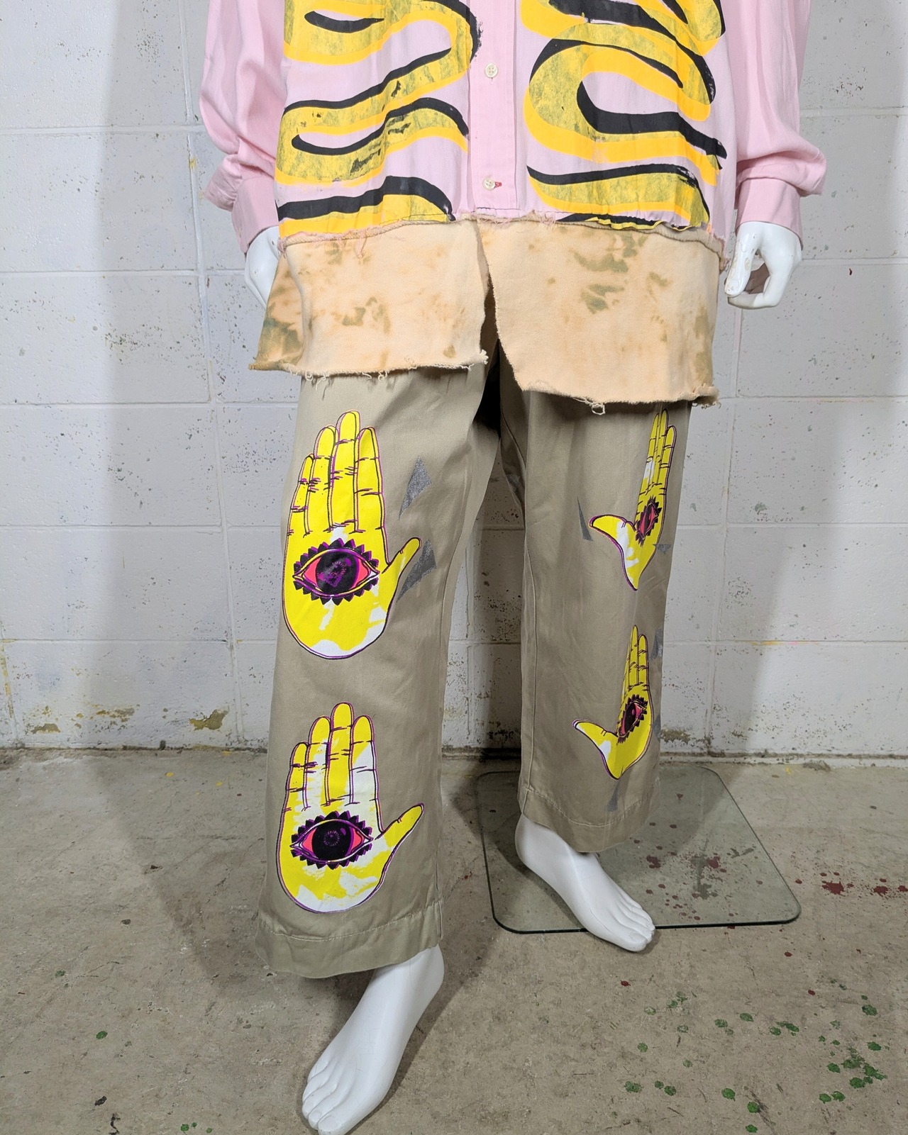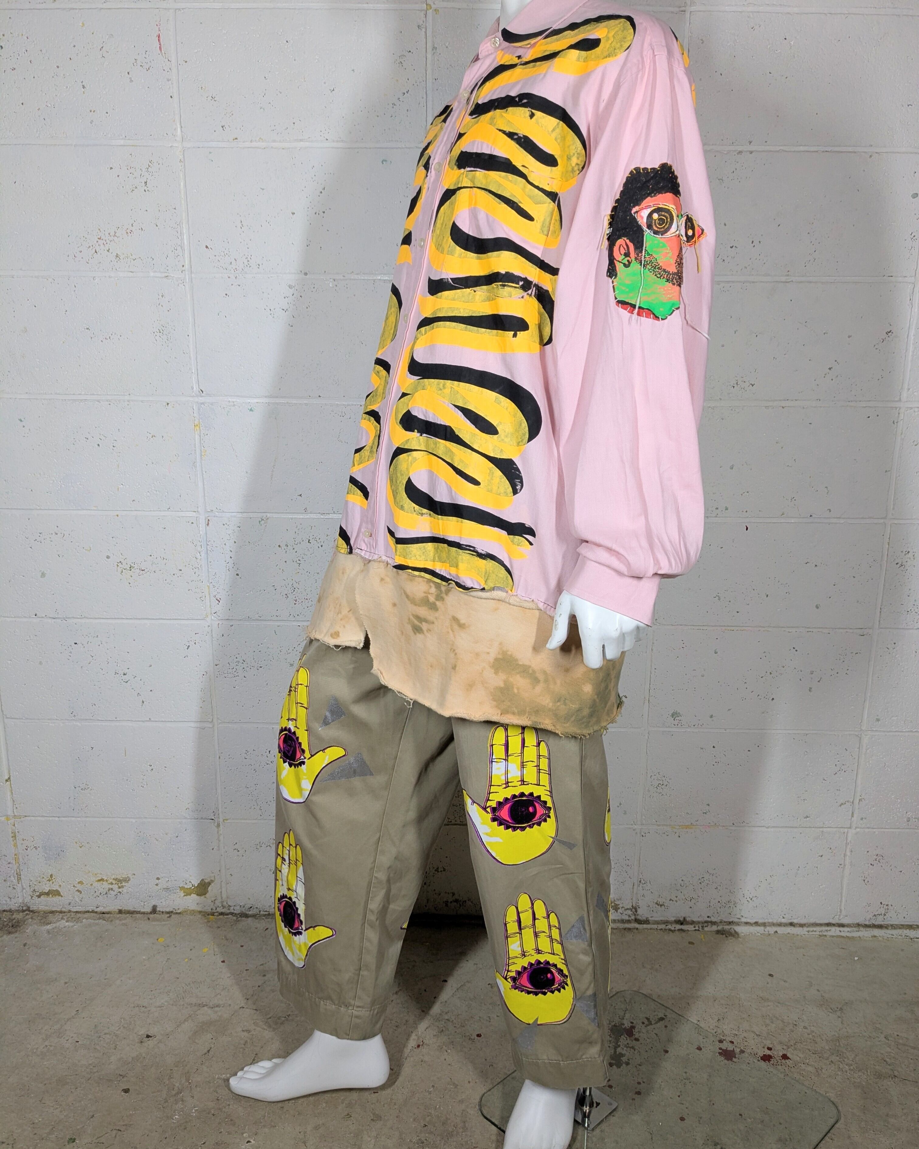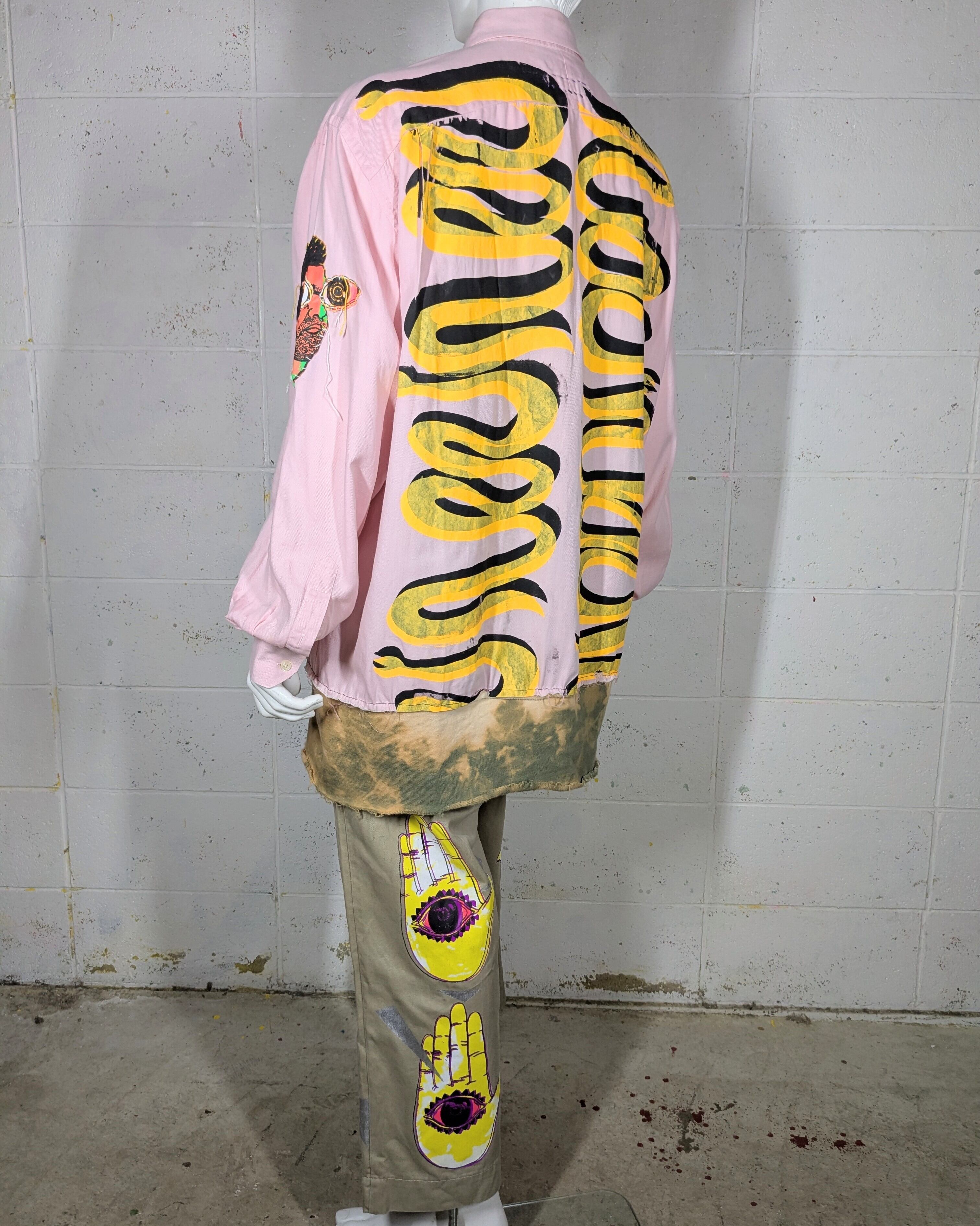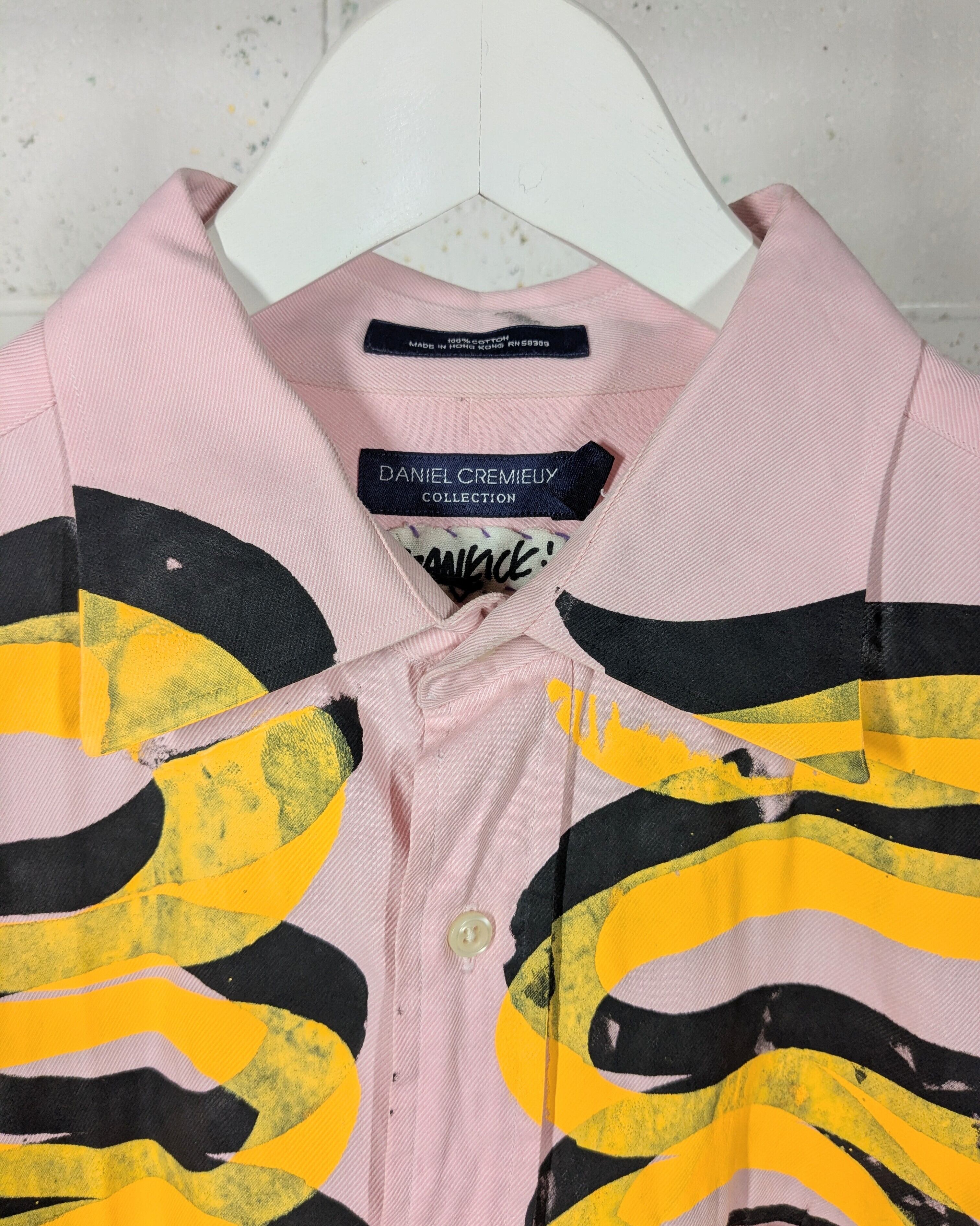 セカンドハンドなシャツにハンドシルクスクリーンをして脱色した生地を縫い付けております。