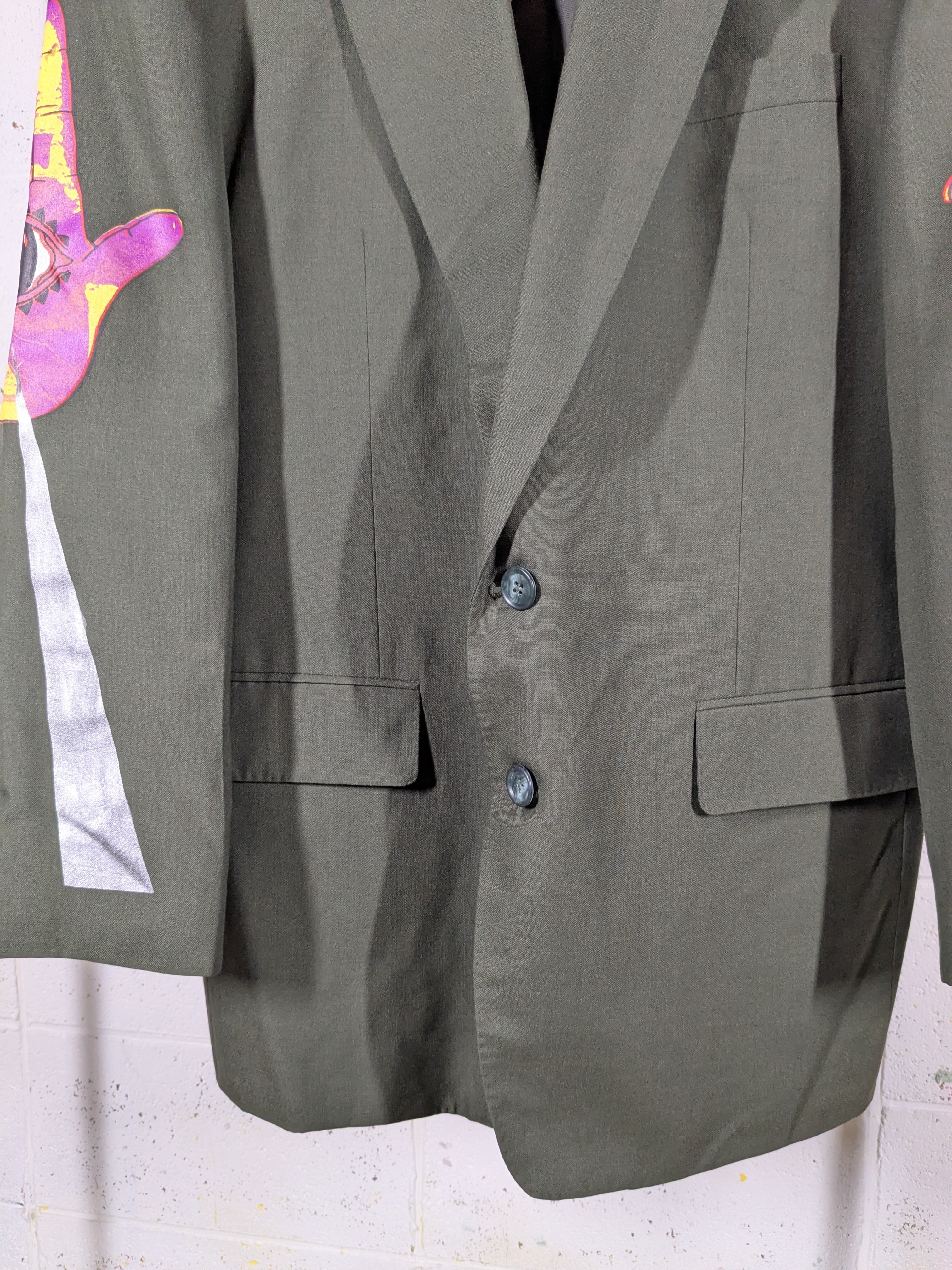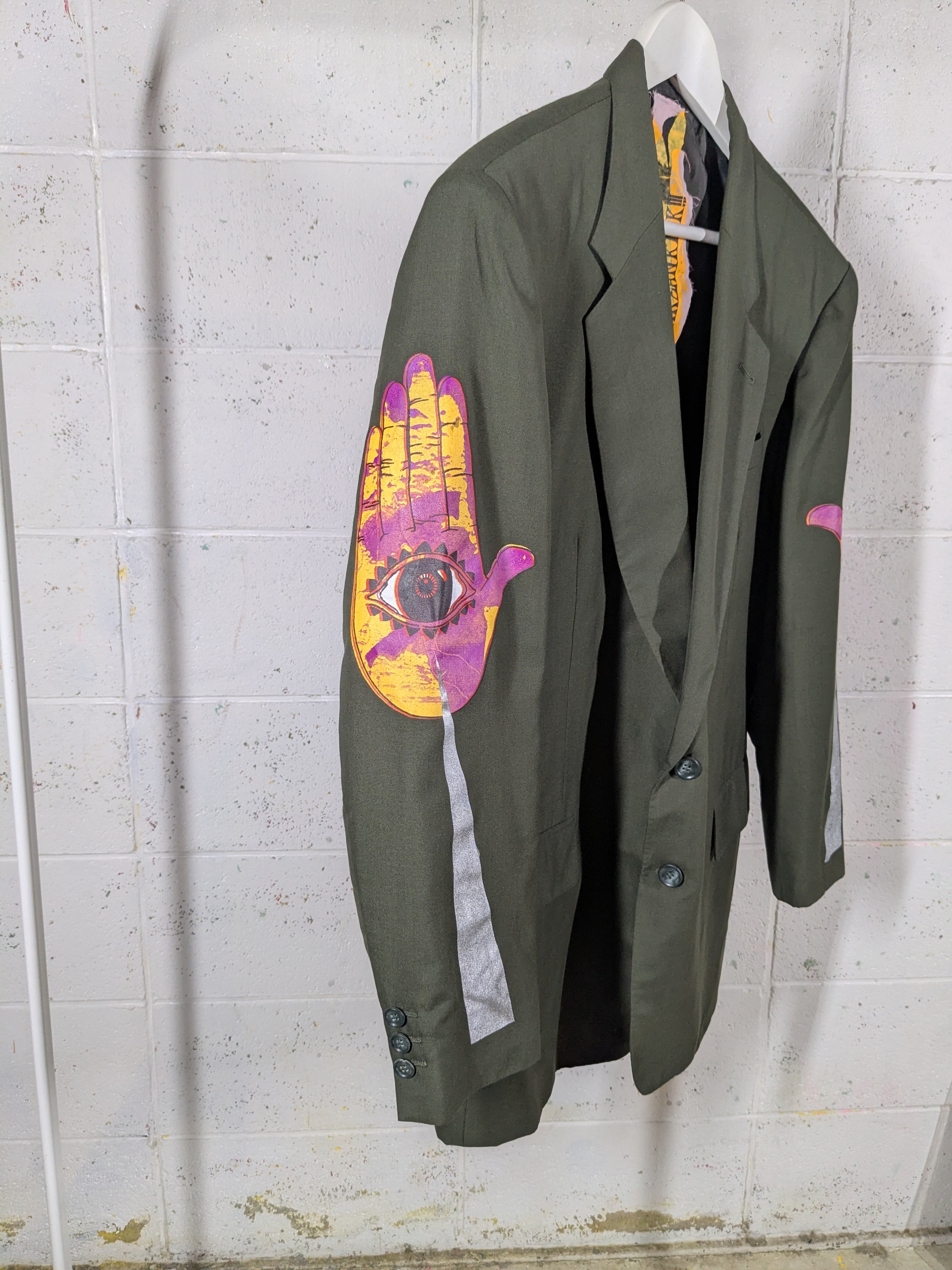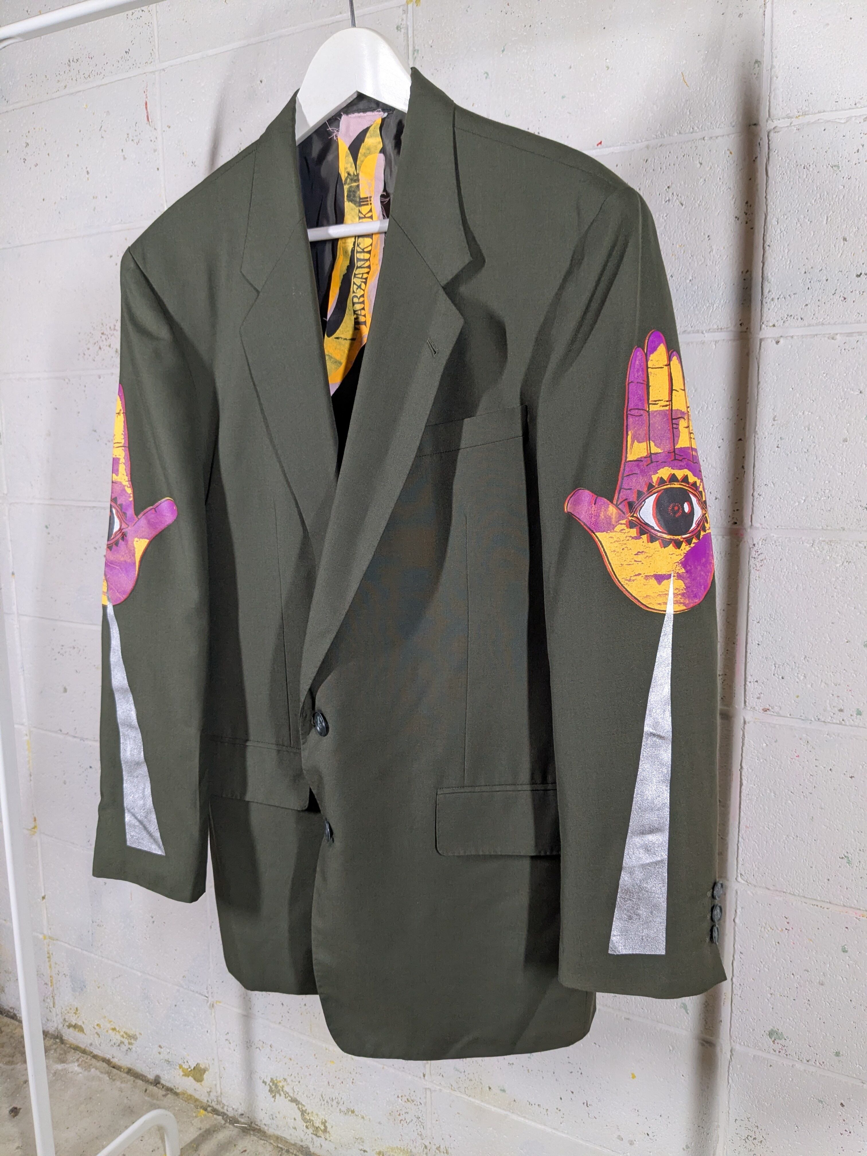 セカンドハンドなジャケットにハンドシルクスクリーンを施しております。