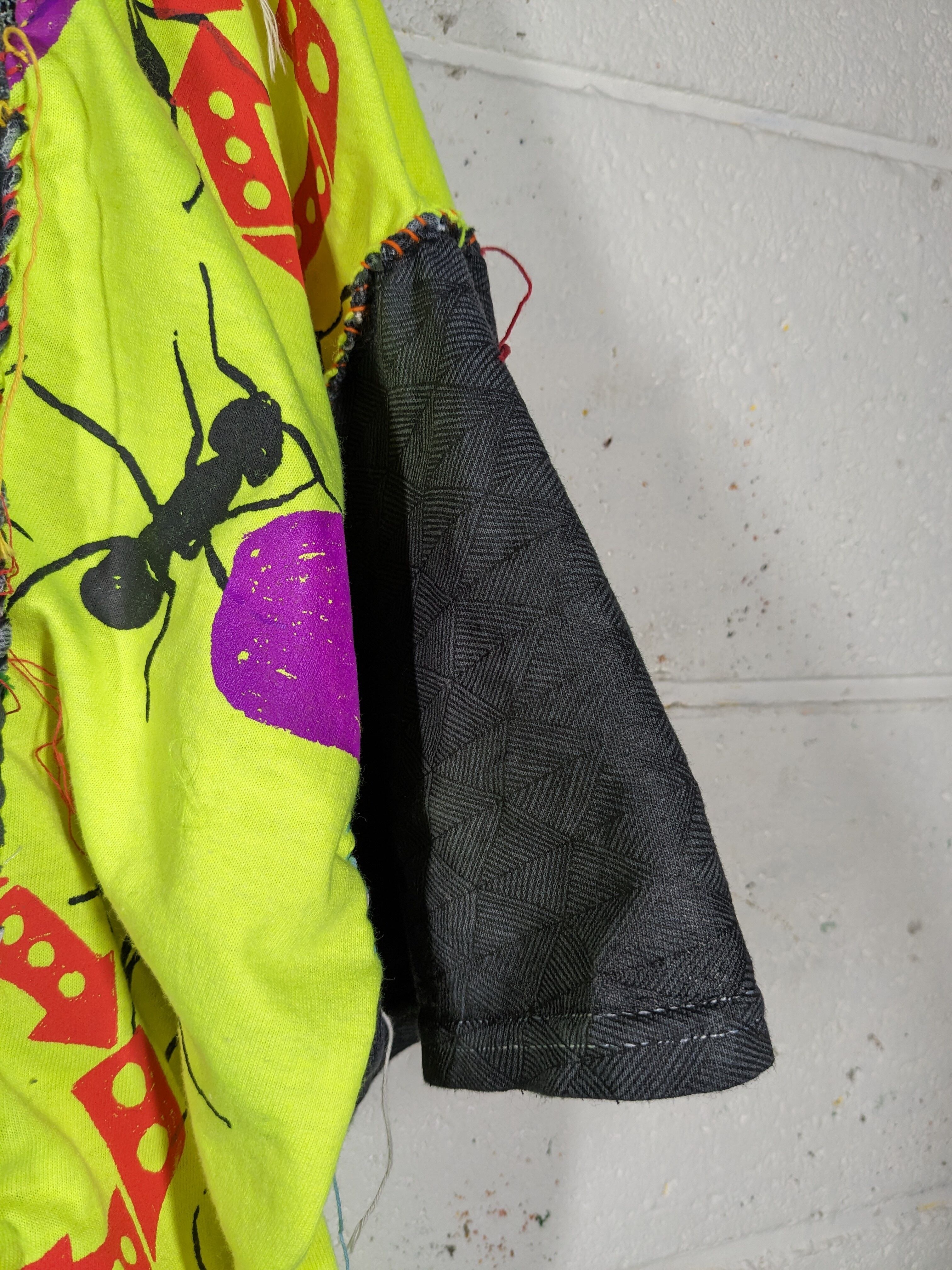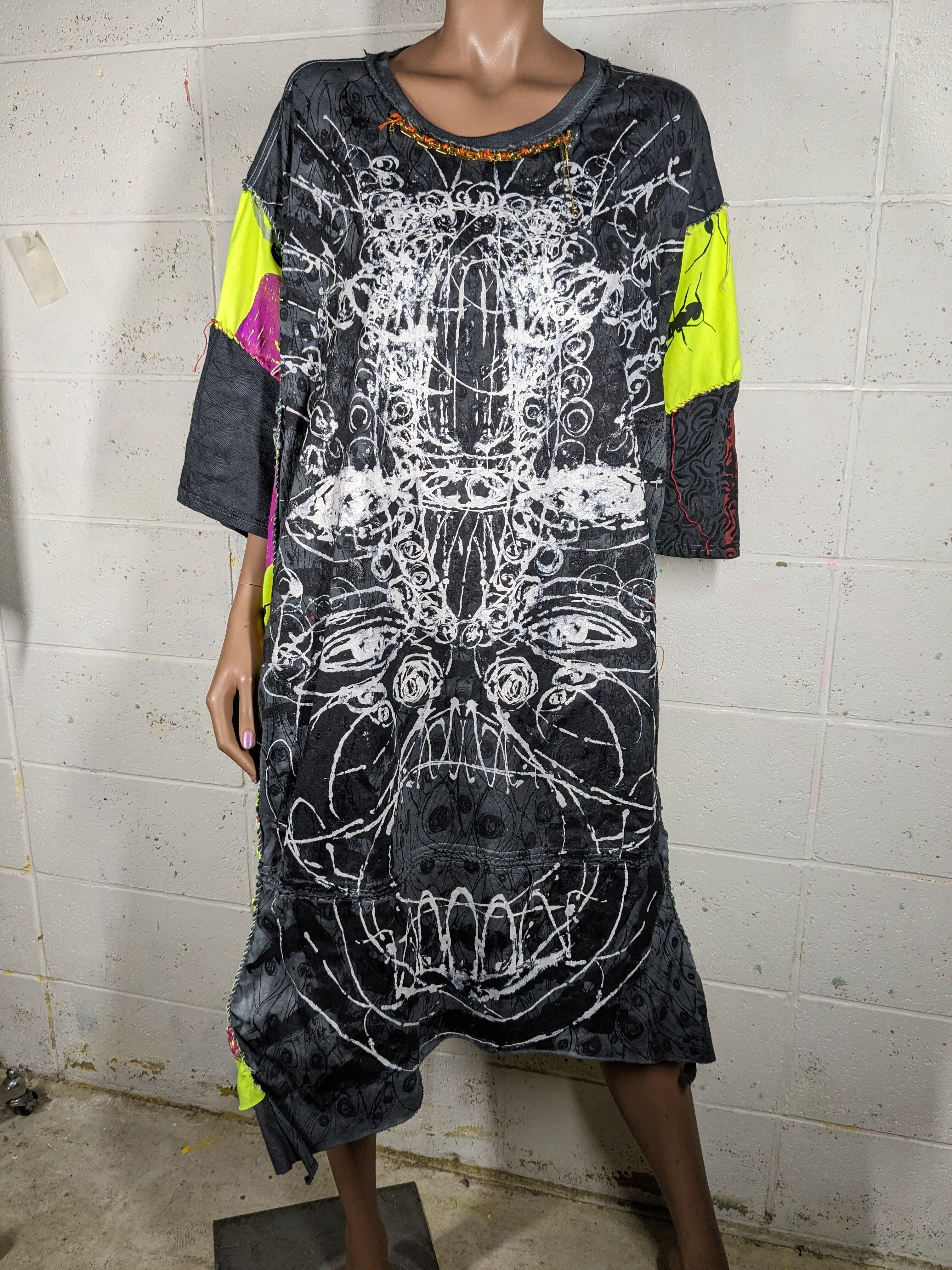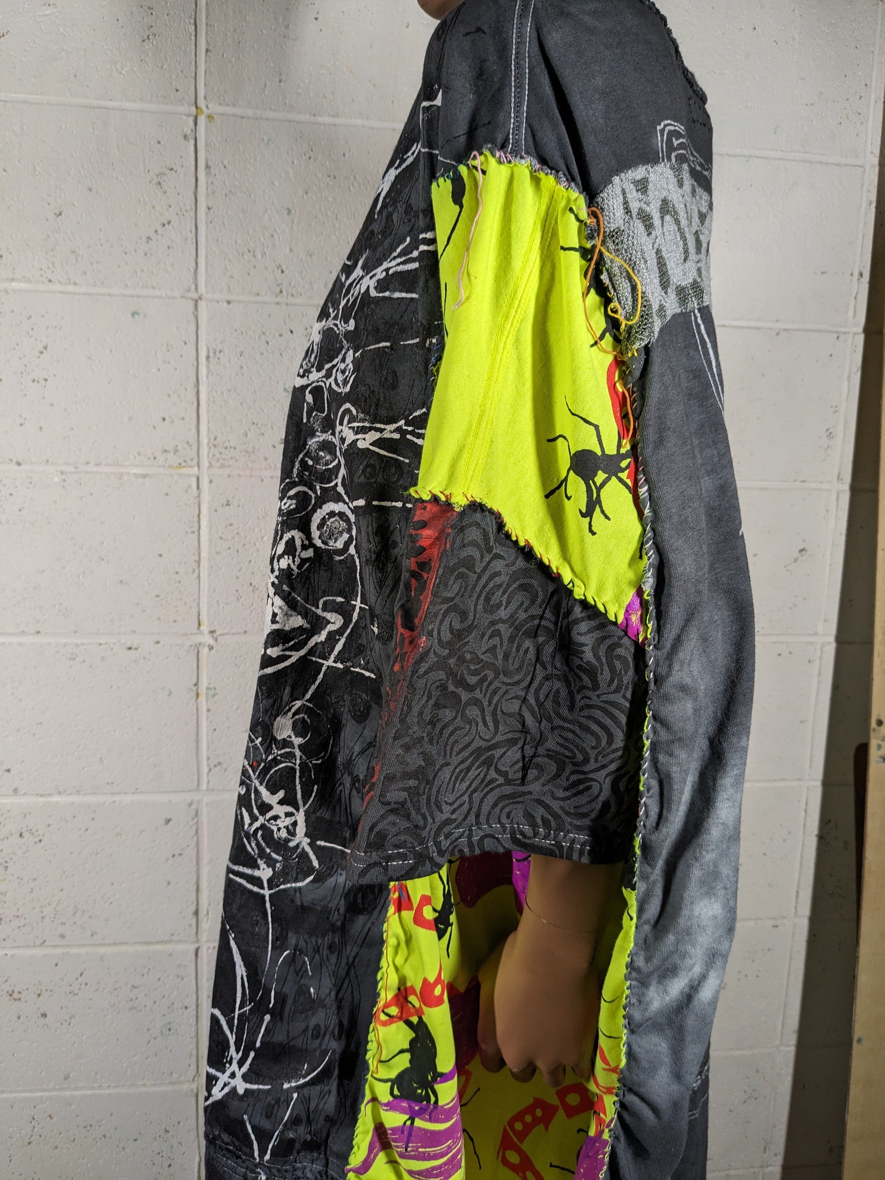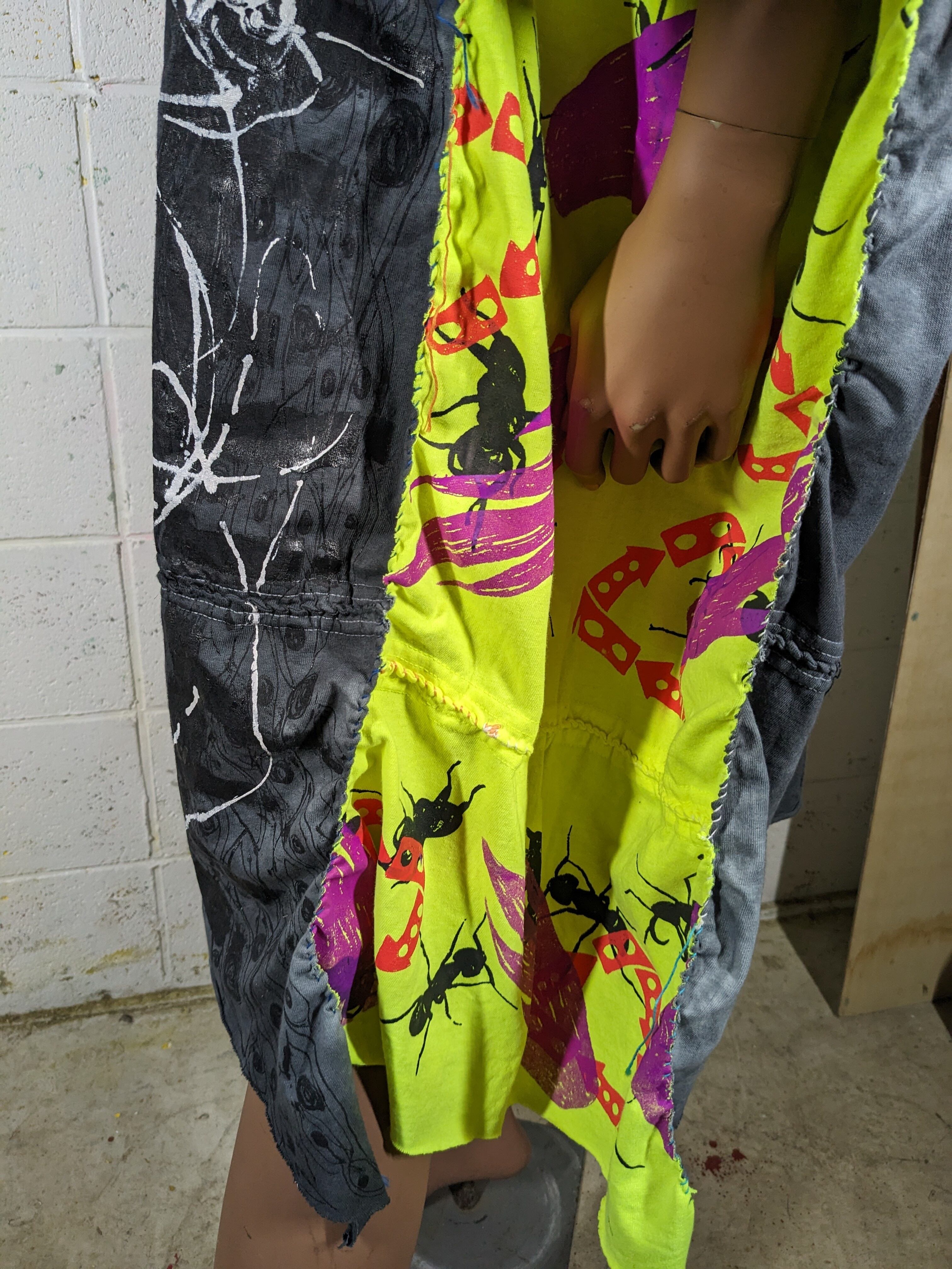 ハンドシルクスクリーンと脱色と染めと手縫いに手描きを施しております。