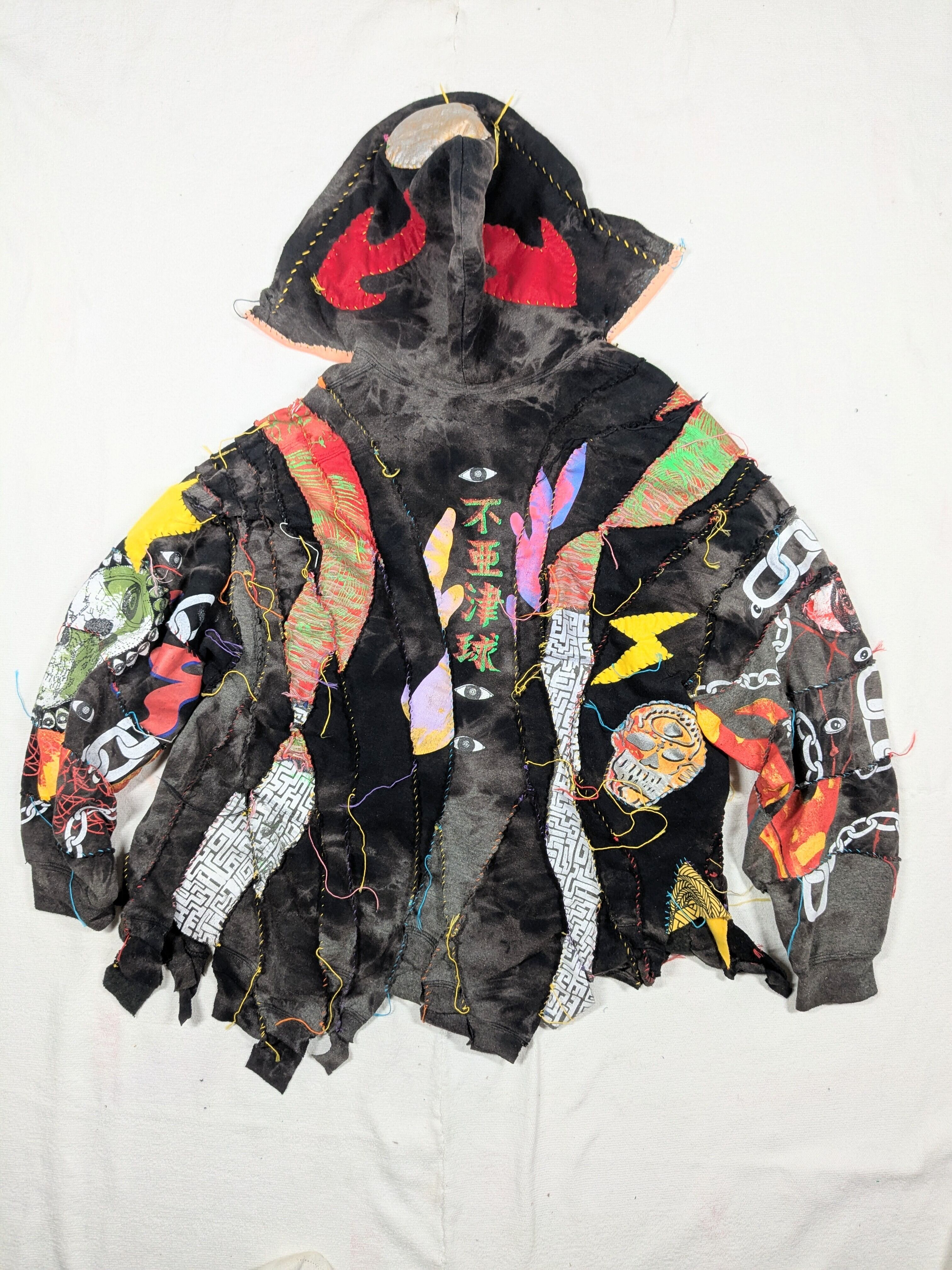 ハンドシルクスクリーンと脱色と手描きに手縫いのフルコースを施しております。